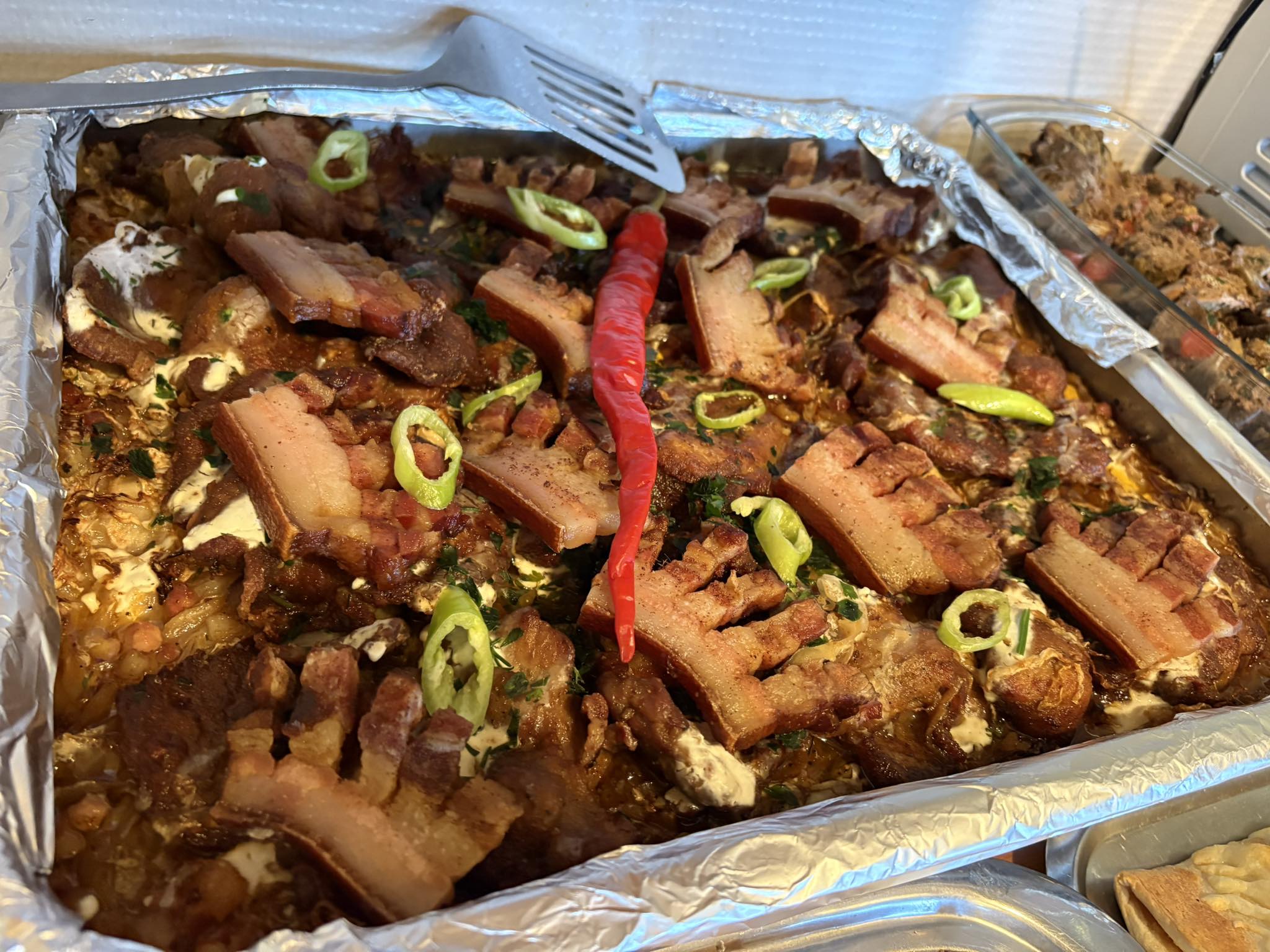 Szaftosra sütött sertésszelet fokhagymás ízesítéssel, ropogósra pirított szalonnával megkoronázva.